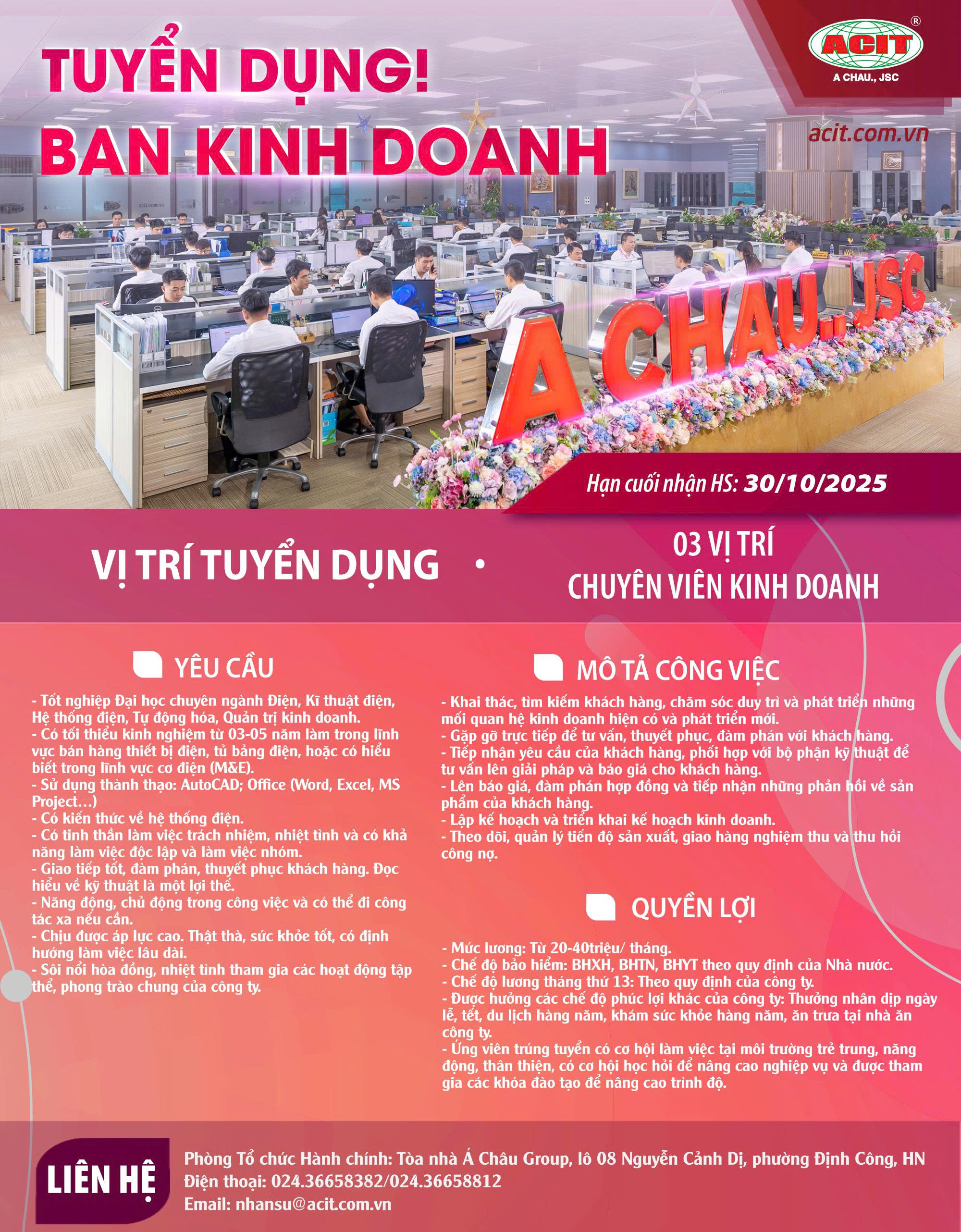 - Phòng Tổ chức Hành chính, Tòa nhà Á Châu Group, lô 08 Nguyễn Cảnh Dị, phường Định Công, Hà Nội.